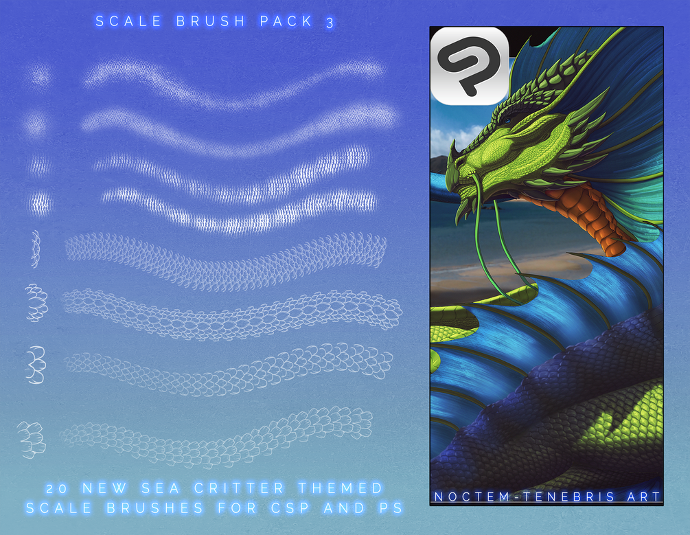 For Mermay, here is a fish/sea critter-themed scale pack for the masses to enjoy, for 20 new brushes to play with for your leisure, enjoy! Clip Studio Paint version.